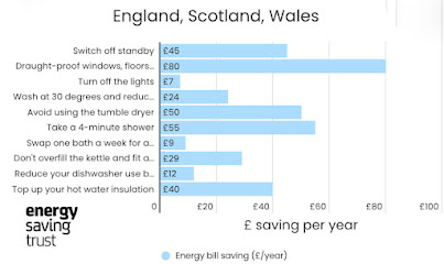 - Washing Machine: Wash at 30 degrees (uses 40% less energy than 40 degrees and saves approx. £24 per year)